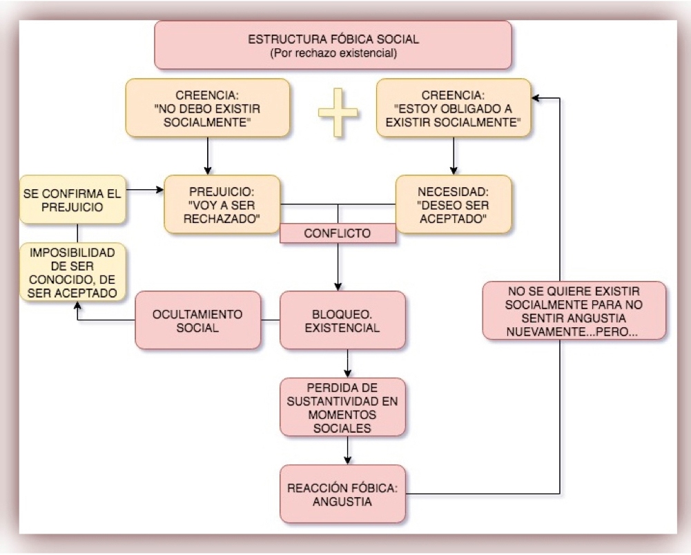 Este fuerte conflicto que se genera en la persona, será imposible de resolver ya que por una parte su forma de evitar las relaciones (ocultándose, no participando, no comunicándose) hará que incremente la posibilidad de ser rechazada por el exterior o en menor medida por lo menos ignorada (algo que vivirá como rechazo), por lo que su existencia social estará presidida por estados de angustia lo que retroalimenta su malestar emocional a nivel social, llegando incluso a momentos de pánico. De este modo puede vivir las situaciones sociales como momentos en los que se puede desencadenar estos fuertes estados emocionales, produciéndose una fobia social. Esto lo podemos ver en el siguiente diagrama: